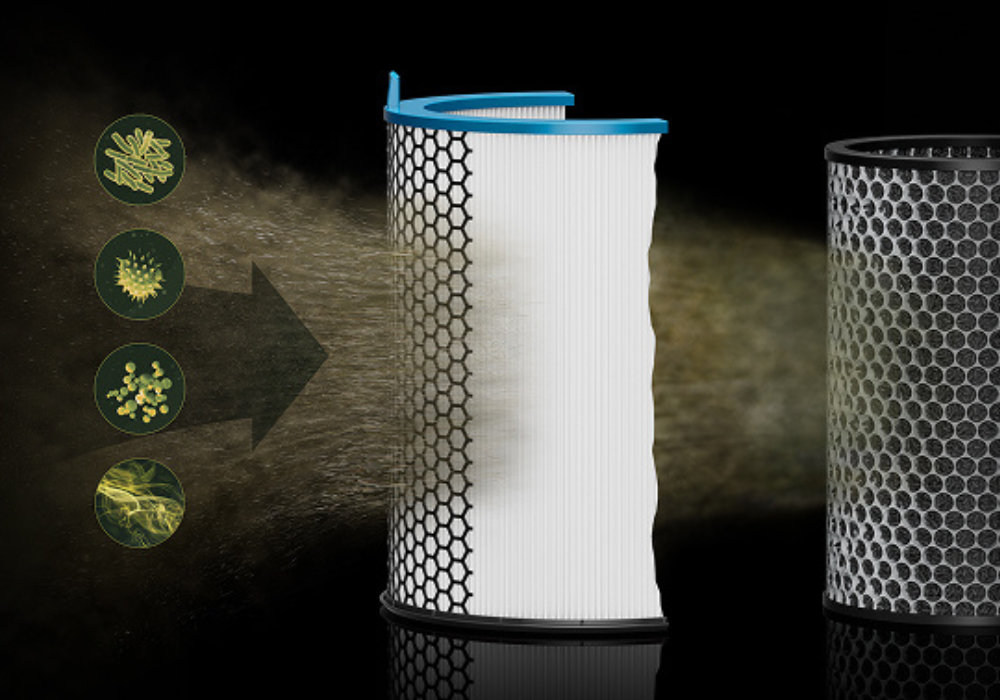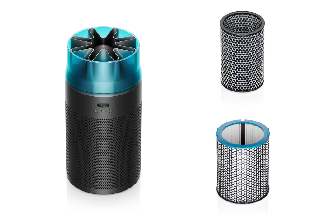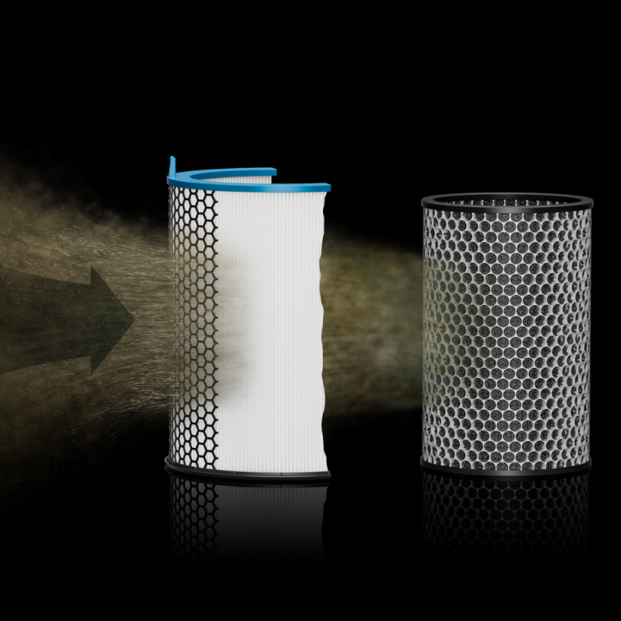 - Φίλτρο ενεργού άνθρακα 360°: Αφαιρεί τις οσμές κατοικίδιων ζώων και μαγειρέματος, ακόμη και αέρια όπως το NO₂ (διοξείδιο του αζώτου)