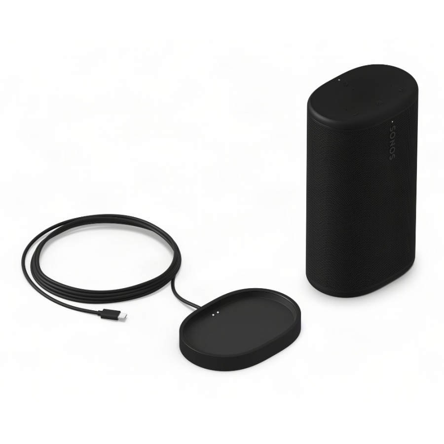 - Βάση φόρτισης: Η βάση φόρτισης που περιλαμβάνεται τοποθετεί το Sonos Play σταθερά στο σπίτι σας. Απαιτεί σύνδεση ρεύματος και συμβατό τροφοδοτικό USB-C/PD 18W ή μεγαλύτερο (πωλείται ξεχωριστά). Για χρήση σε εσωτερικό χώρο μόνο, δεν είναι σχεδιασμένη για χρήση σε εξωτερικές καιρικές συνθήκες