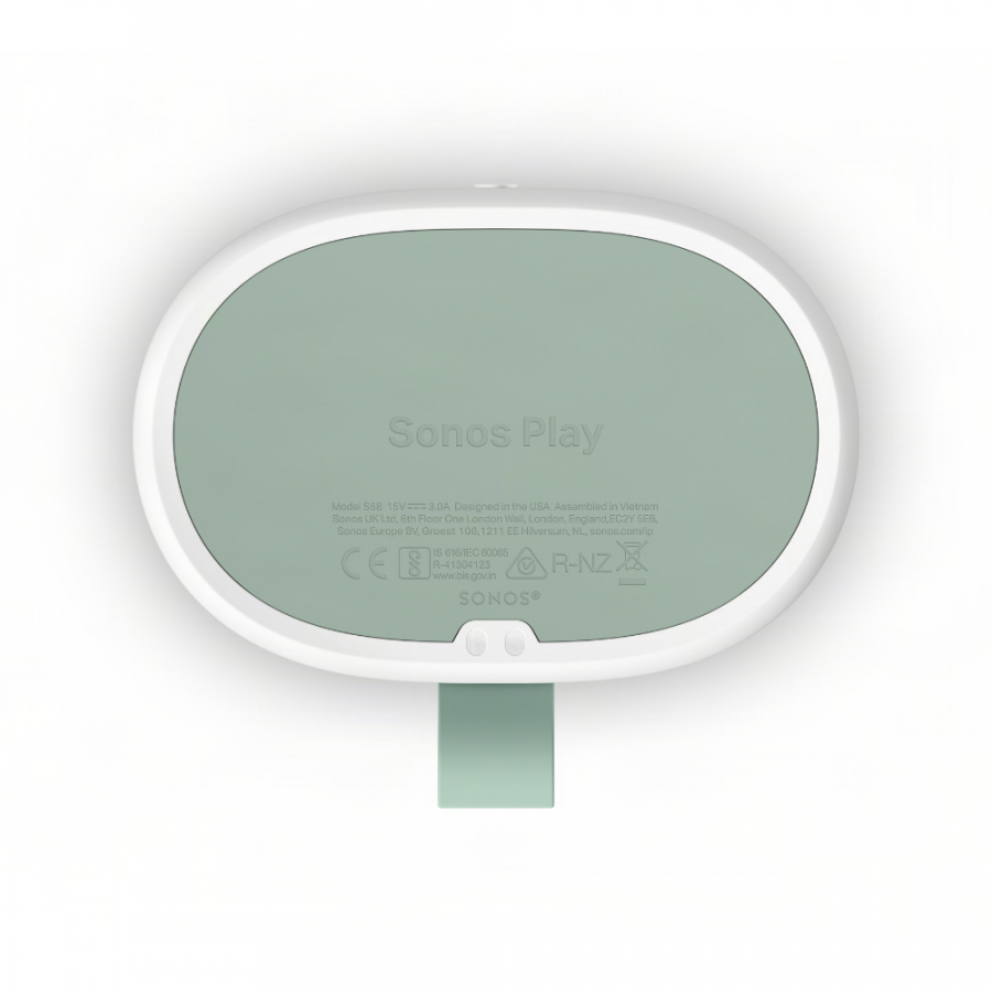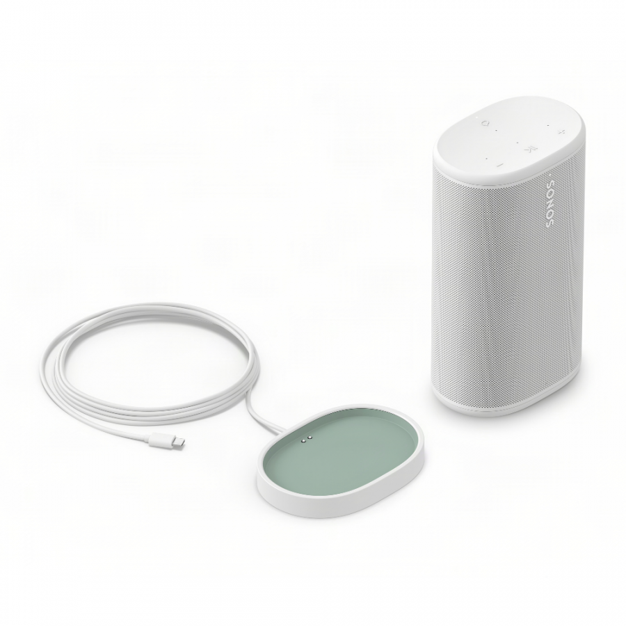 - Βάση φόρτισης: Η βάση φόρτισης που περιλαμβάνεται τοποθετεί το Sonos Play σταθερά στο σπίτι σας. Απαιτεί σύνδεση ρεύματος και συμβατό τροφοδοτικό USB-C/PD 18W ή μεγαλύτερο (πωλείται ξεχωριστά). Για χρήση σε εσωτερικό χώρο μόνο, δεν είναι σχεδιασμένη για χρήση σε εξωτερικές καιρικές συνθήκες